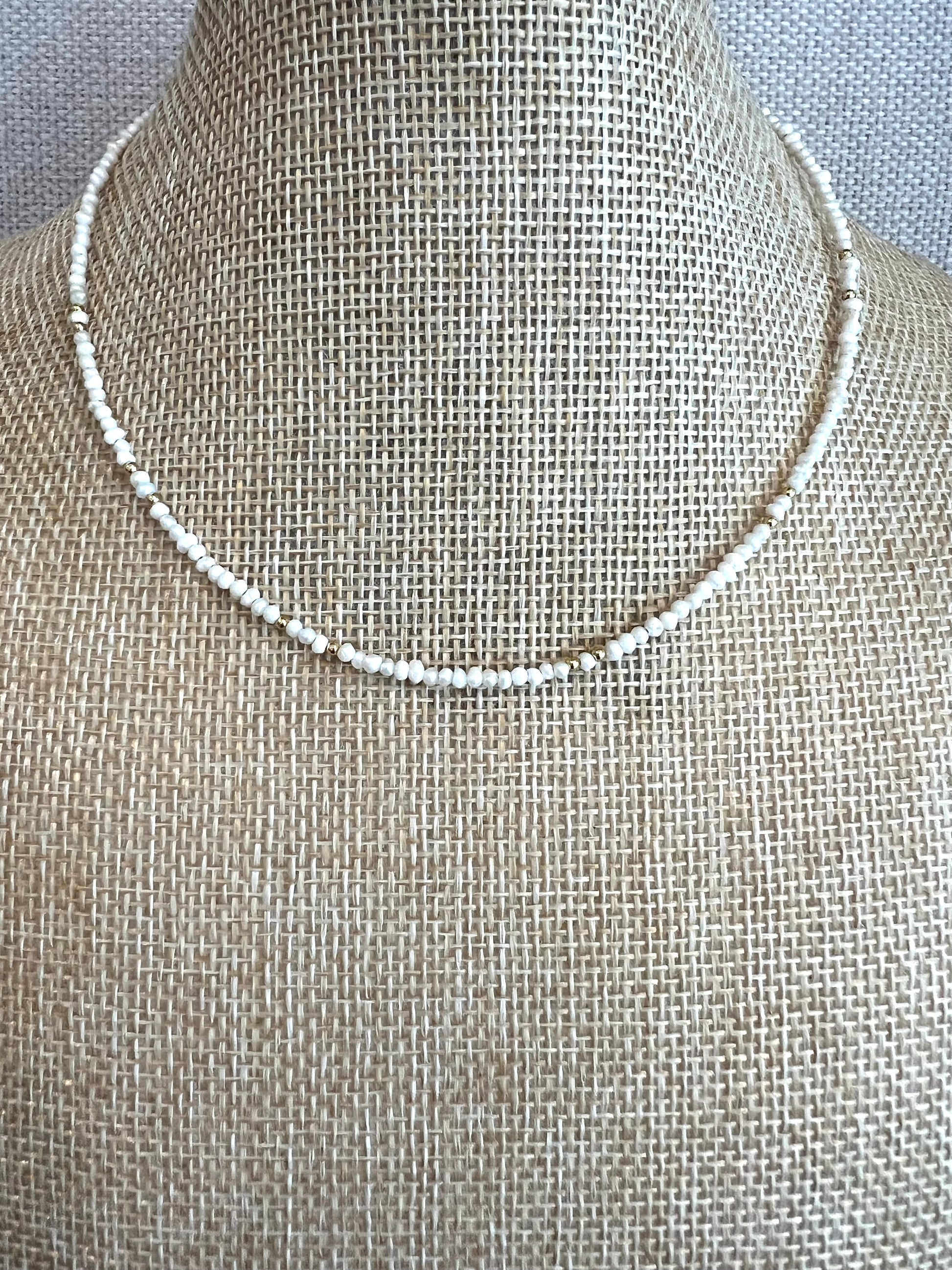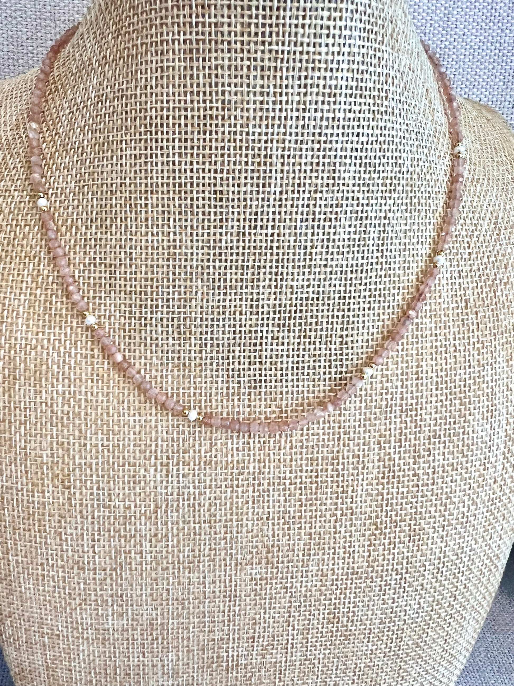 2 mm gem stone and pearl bead necklace. Adjustable 15.5-17” perfect for layering. Available in turquoise, garnet, lapis, sapphire, onyx, mother of pearl, pink moonstone and labradorite.