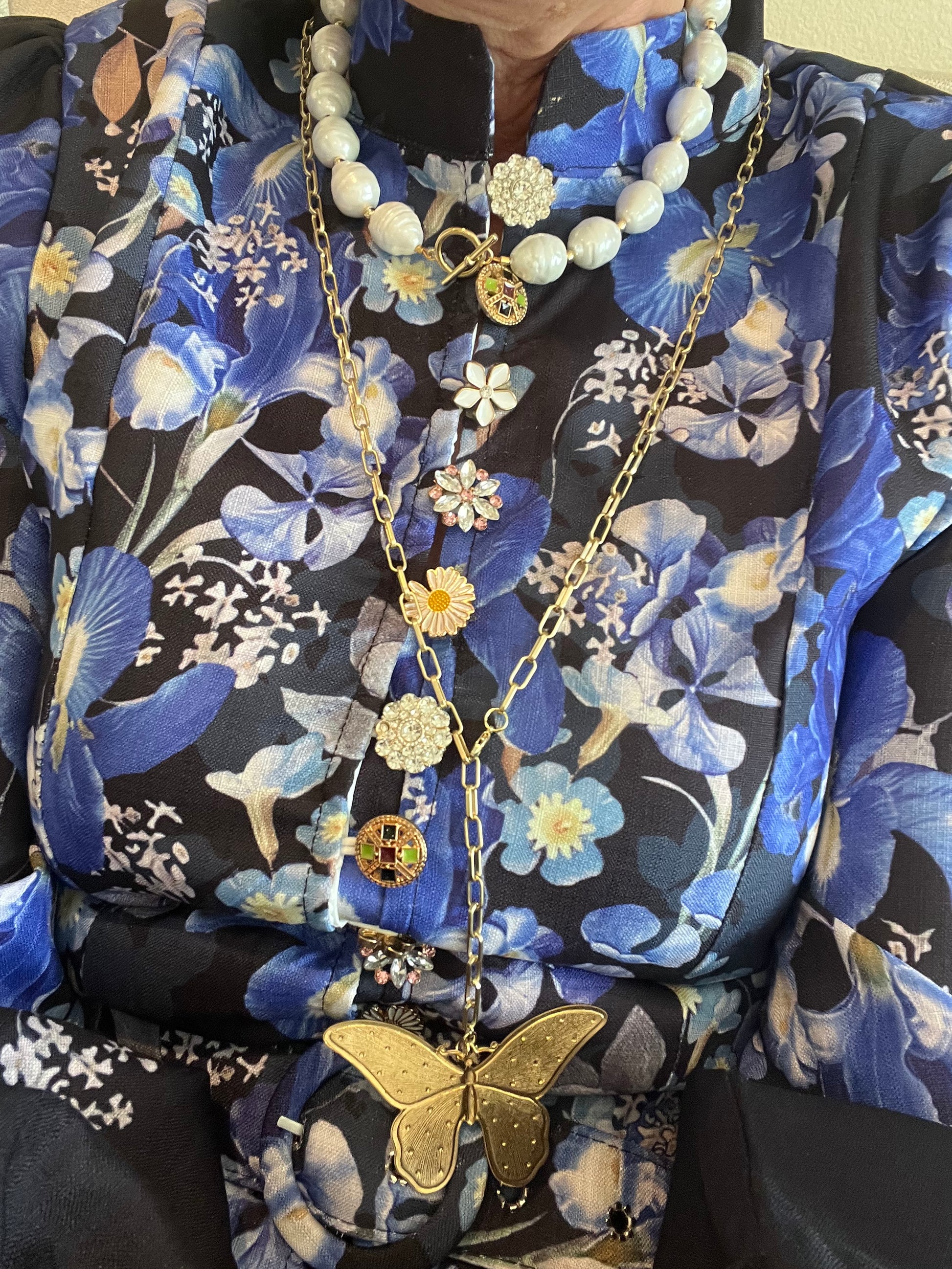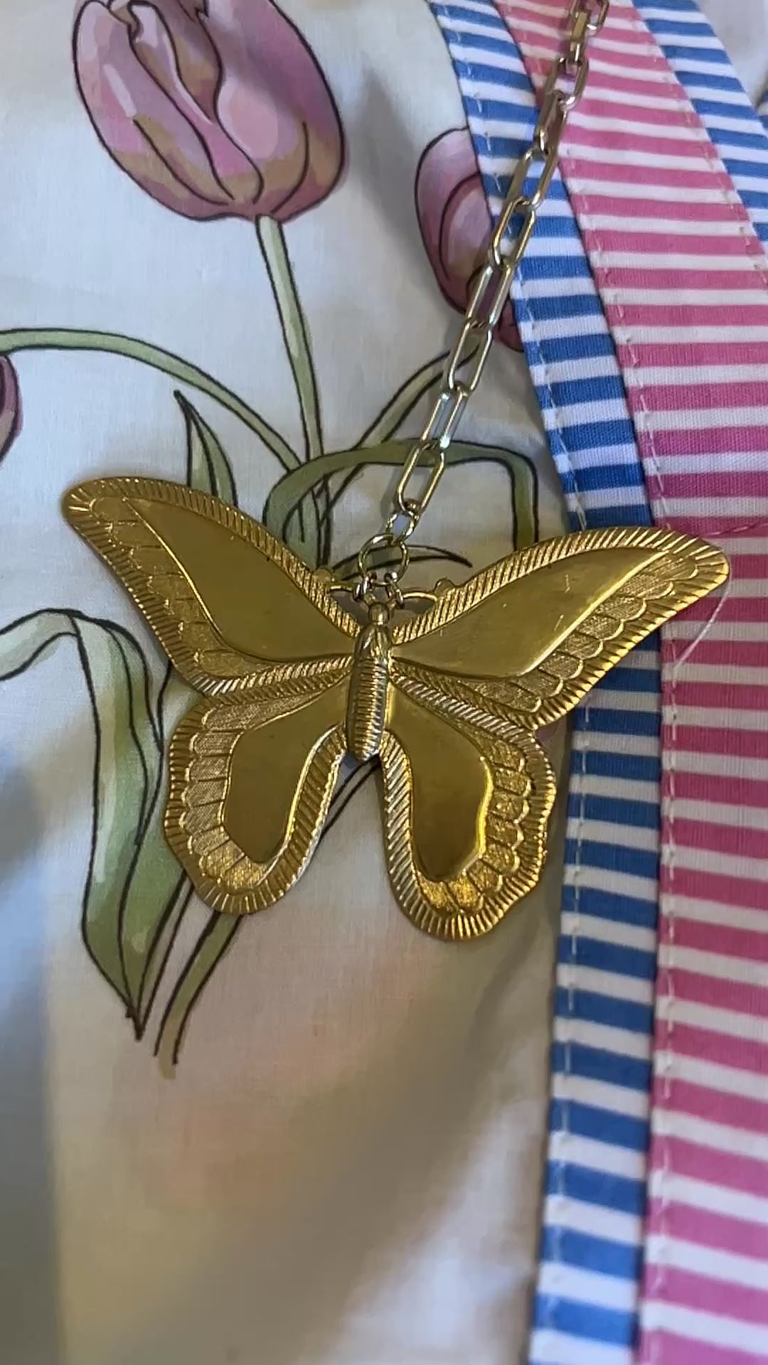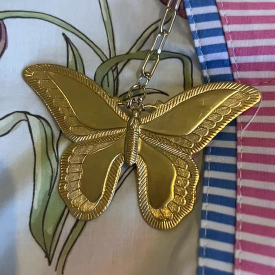 Matte gold box chain necklace with large brass butterfly pendant. 30" length can be adjusted and clasped at any length as Y necklace or lariat. Many ways to wear.