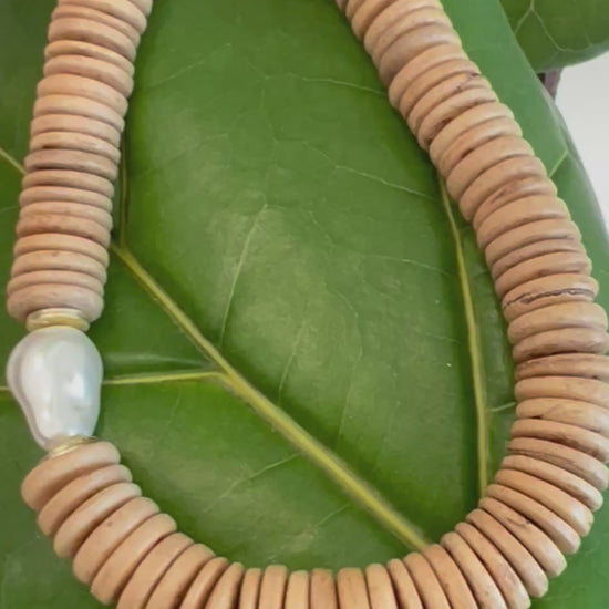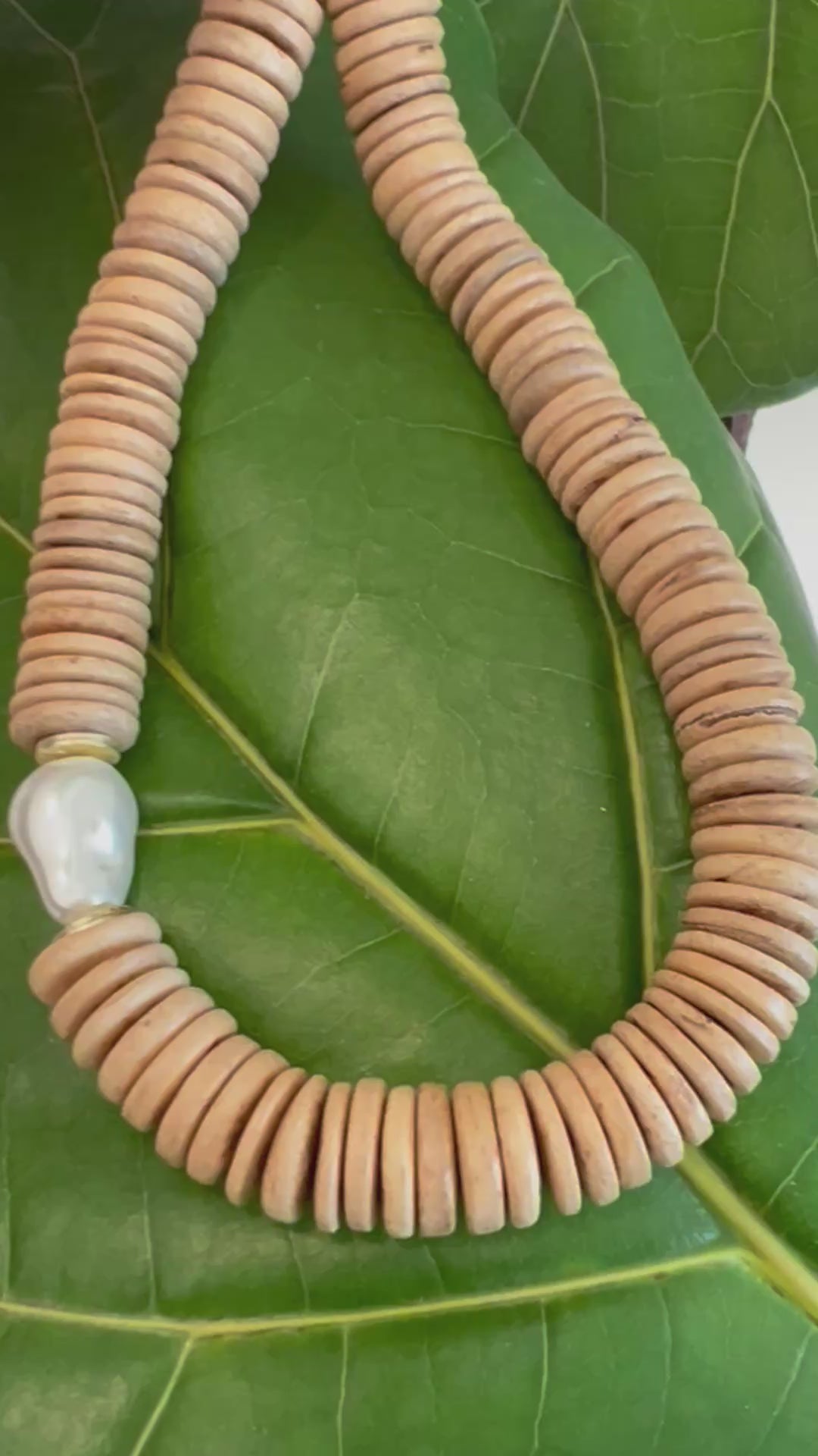 This fun statement necklace will turn heads wherever you go. Be bold and beautiful in this coconut shell bead necklace . Freshwater baroque pearl and gold disk accents provide an unexpected mix of materials. The length is adjustable 15-17."
