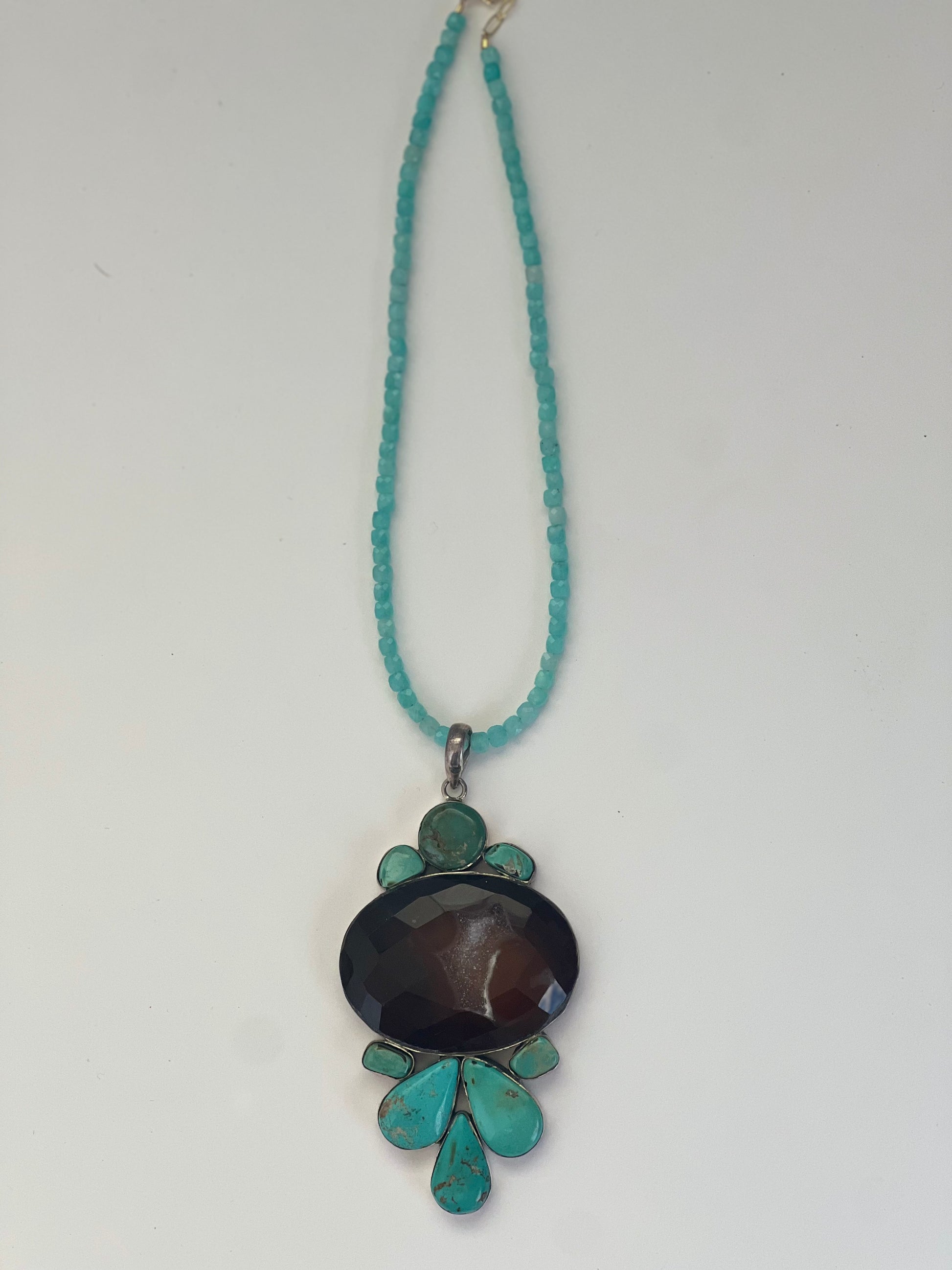 This statement stunner won't stay around long . It's a brilliant vintage piece on Peruvian amazonite beads. Absolutely stunning and the pendant can come off and be worn with other beads. Adjustable 15-17" length.