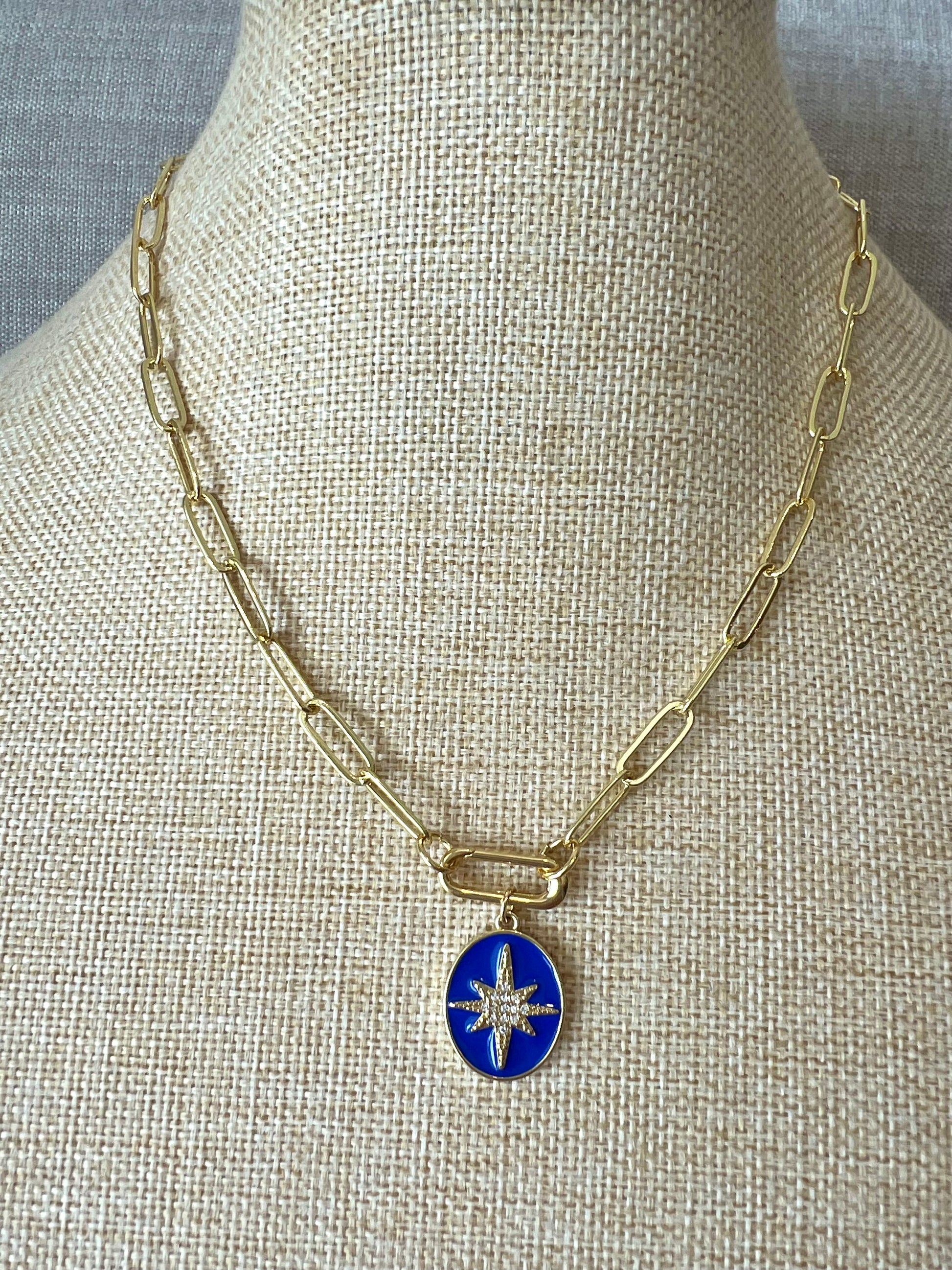 Choose your charm & your chain. Various colors and chain options available . Baby paperclip 18" adjustable Y, regular paperclip with carabiner clasp, & uball chain with carabiner clasp . This fun necklace is easy to layer and will be a favorite.