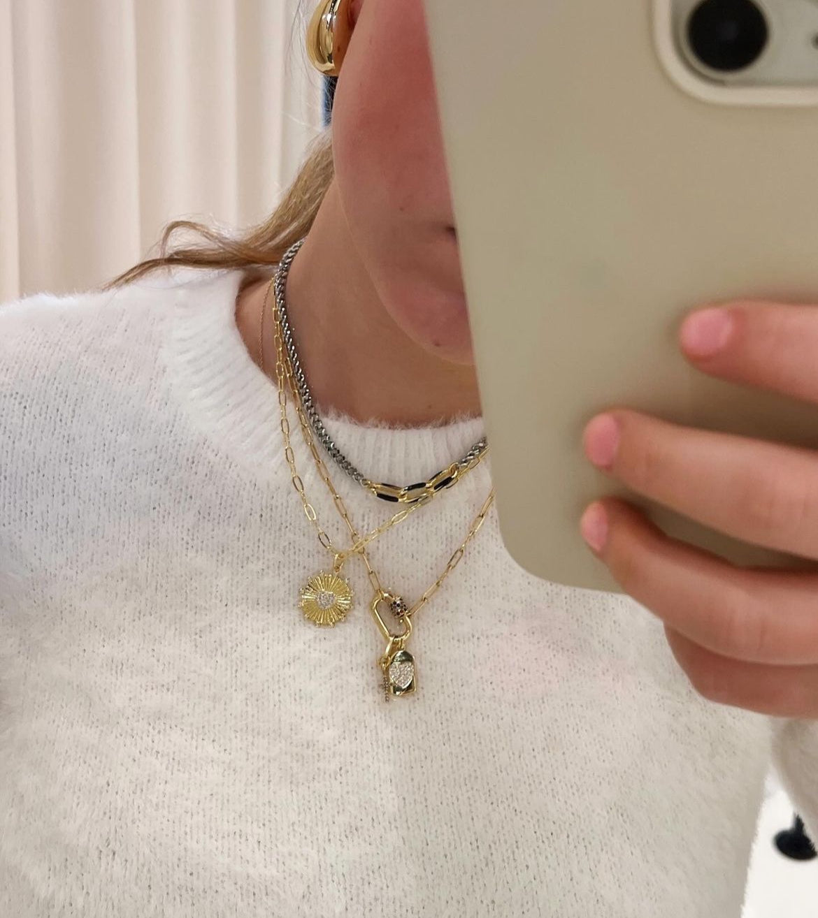 Gold plated fluted heart pendant with CZ accents on 16” gold plated bead or paperclip chain. Custom length and chain options