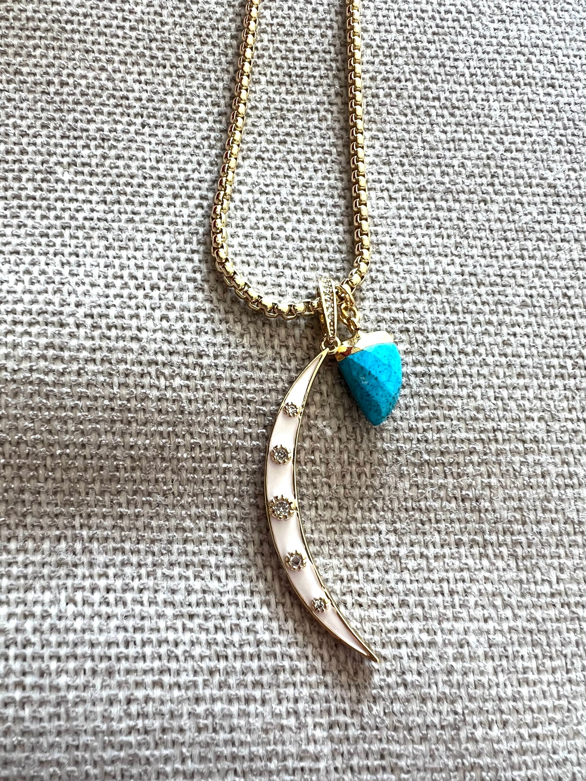 16” gold plated boxchain necklace with 2” enamel horn with CZ accents Necklace has 2” extender to 18”. Custom lengths available