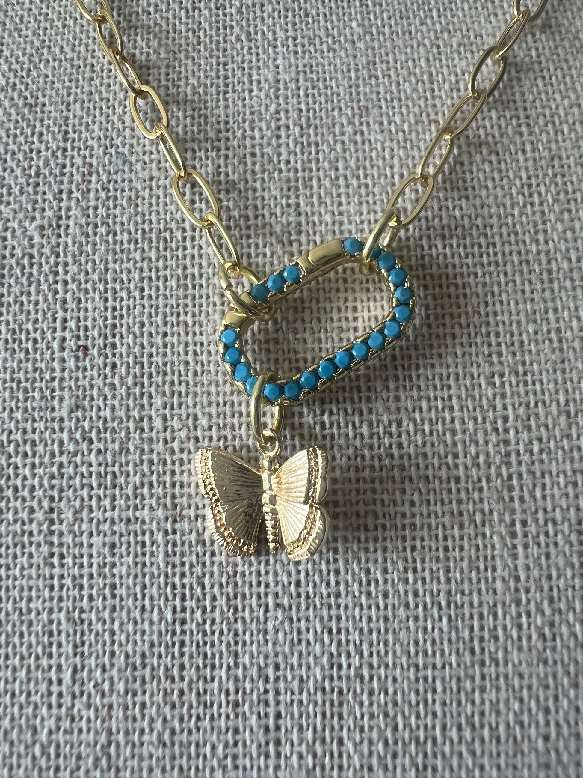 Baby gold plated paperclip chain necklace with turquoise carabiner lock. Adjustable 15-17". A perfect piece alone or layered . Comes with baby gold butterfly charm .
