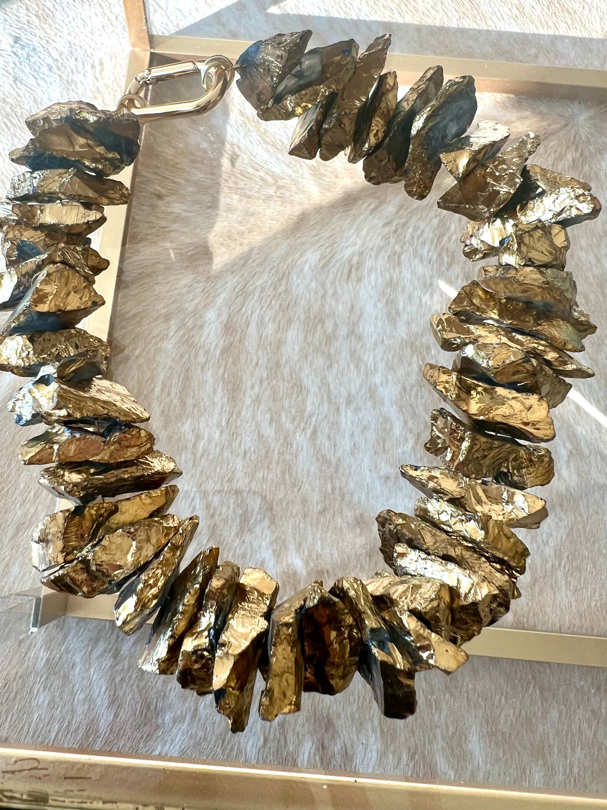 This golden metallic coated agate nuggets makes the perfect holiday statement piece. This piece will make the outfit. Length is 16." Custom lengths available by special order