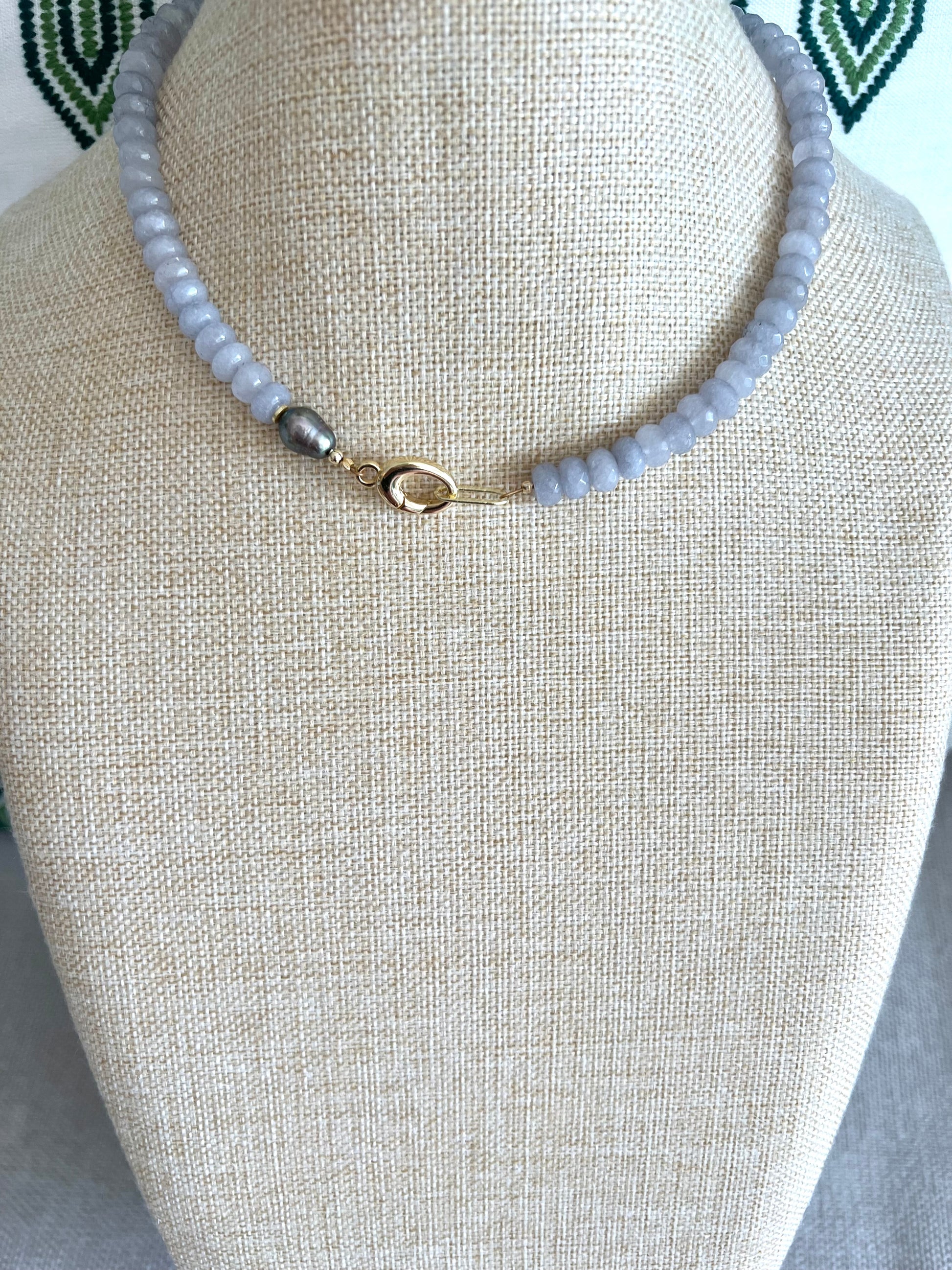 Faceted soft gray jade rondel shape bead necklace with a gray freshwater pearl accent and front closure 16" length. Gold plated hardware. Add a charm or not. Wear alone or layer.
