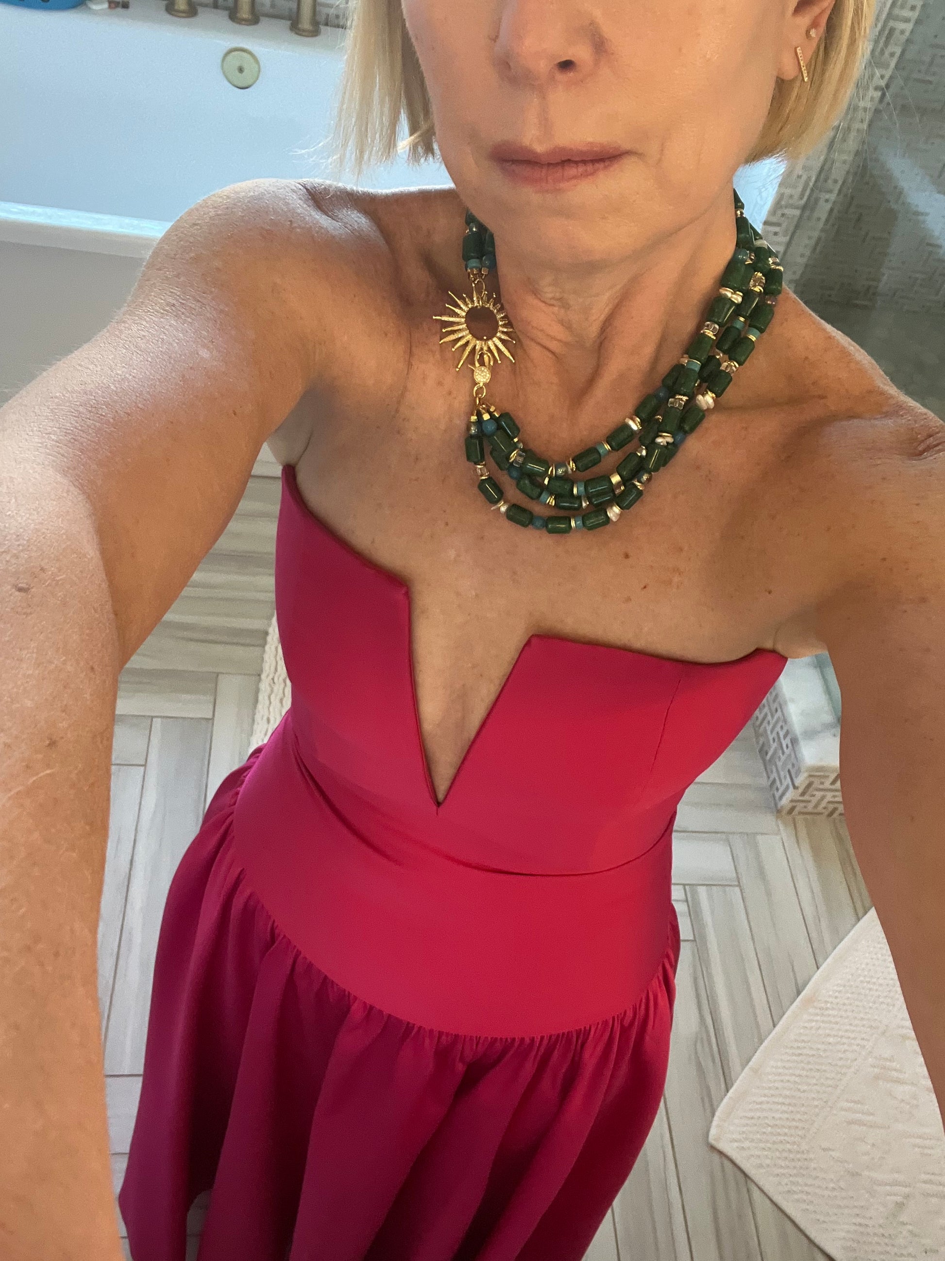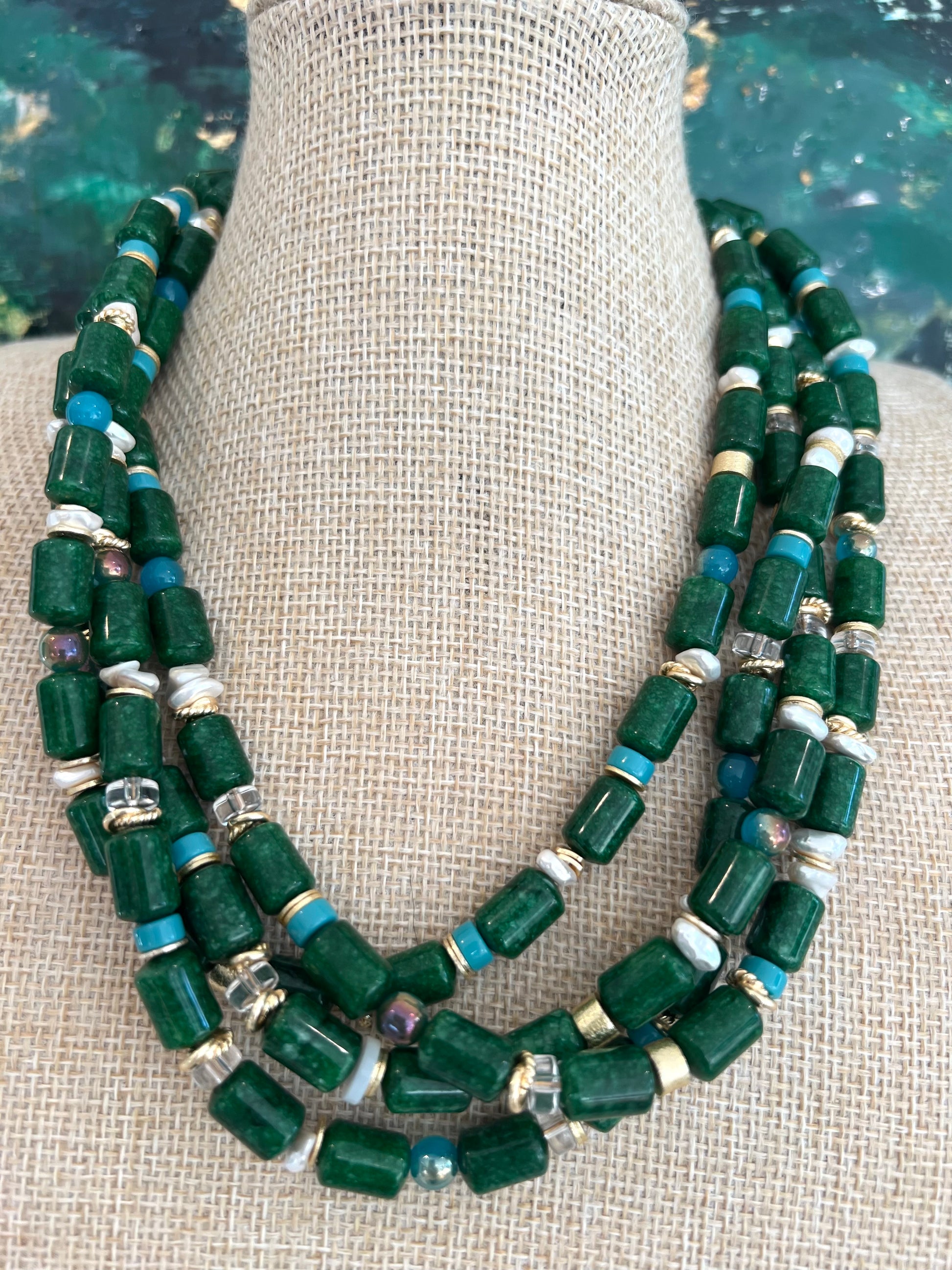 Green goodness sure to make a statement. 4 strands of agate barrel bead with glass, pearl and gold plated accents. Lengths range 17-19."