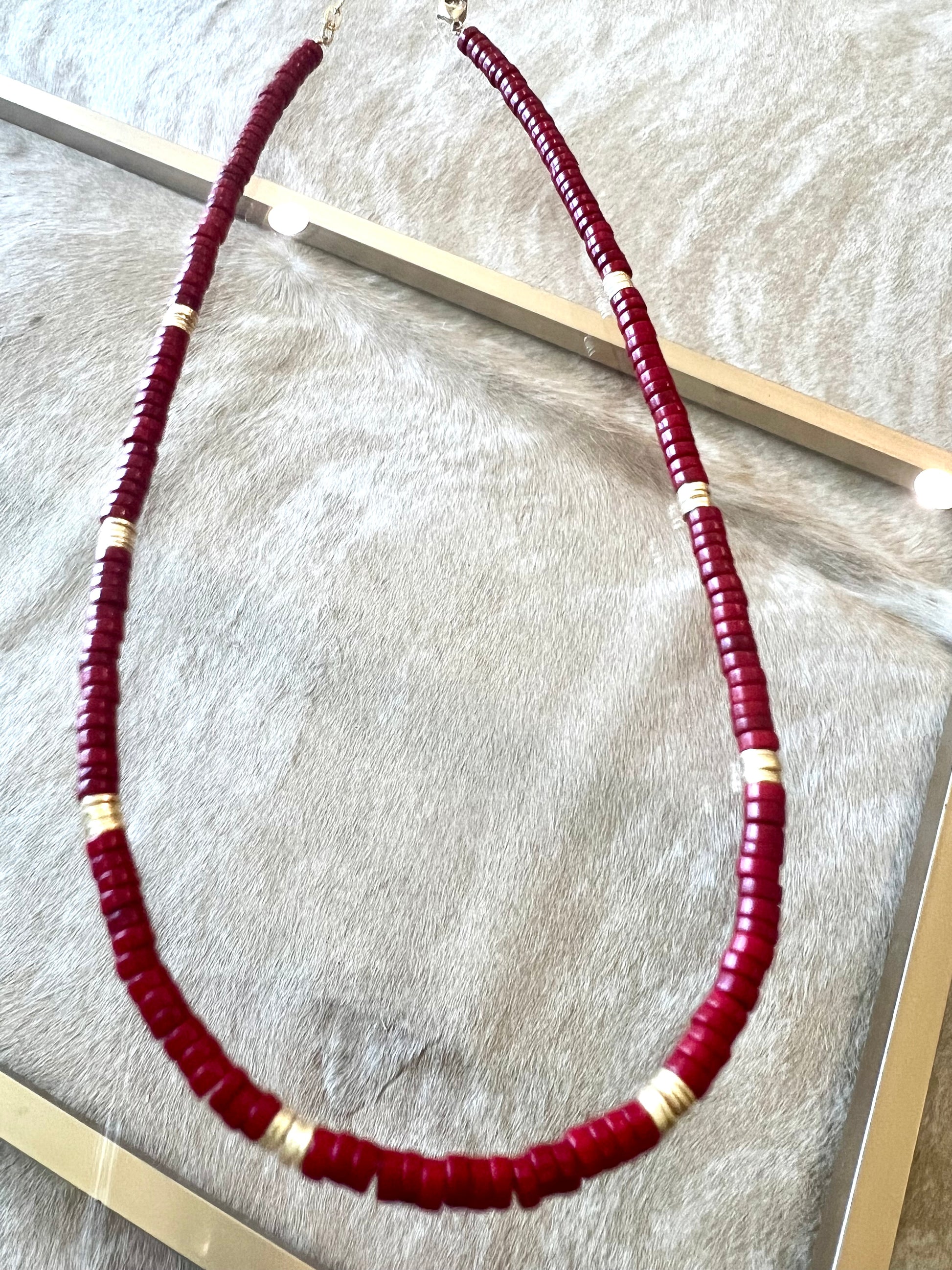Magnesite heishi bead necklace with gold plated spacer disks. Adjustable 15-17". Available in varioys colors. Perfect for layering and for a touch of school spirit. Custom options (colors and lengths) available by special order. Get yours today.