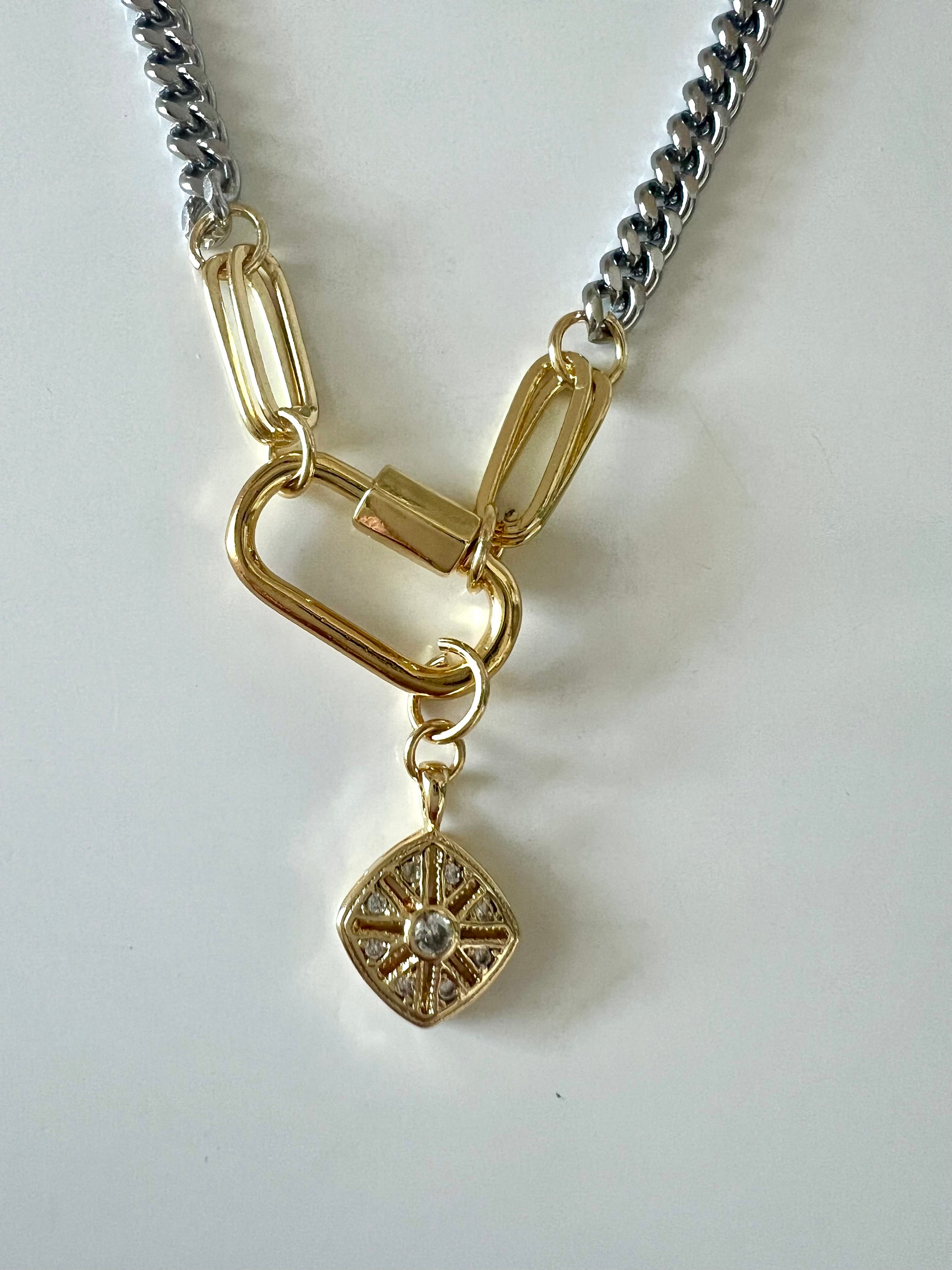 Adjustable 15-17” stainless chain with gold plated carabiner with burst pendant. Can be wrapped and layered or worn alone