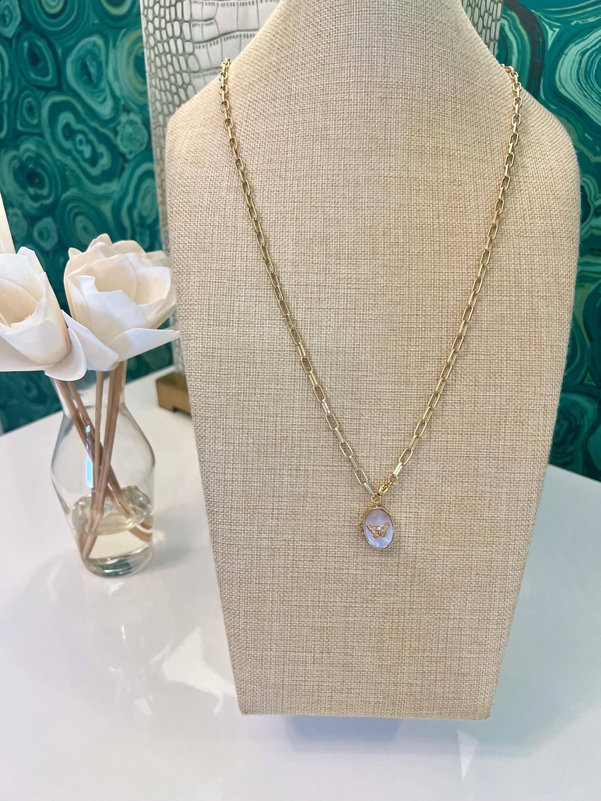 30" matte box chain necklace with mother of pearl butterfly locket. Adjustable and can be worn as standard or y necklace. Order custom length of32" to double .