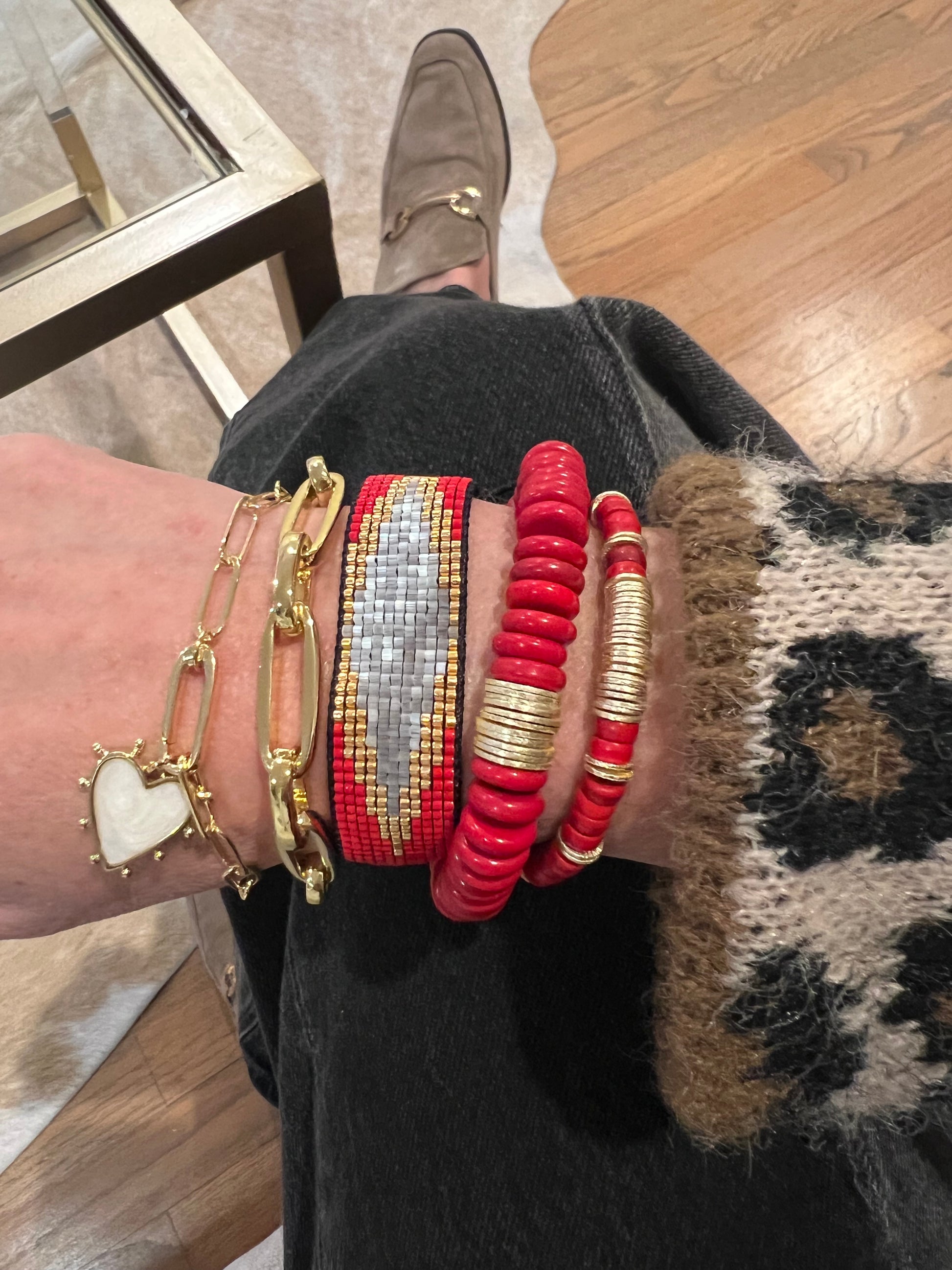 16" gold plated paper clip chain with toggle clasp and mother of pearl spiked heart pendant.