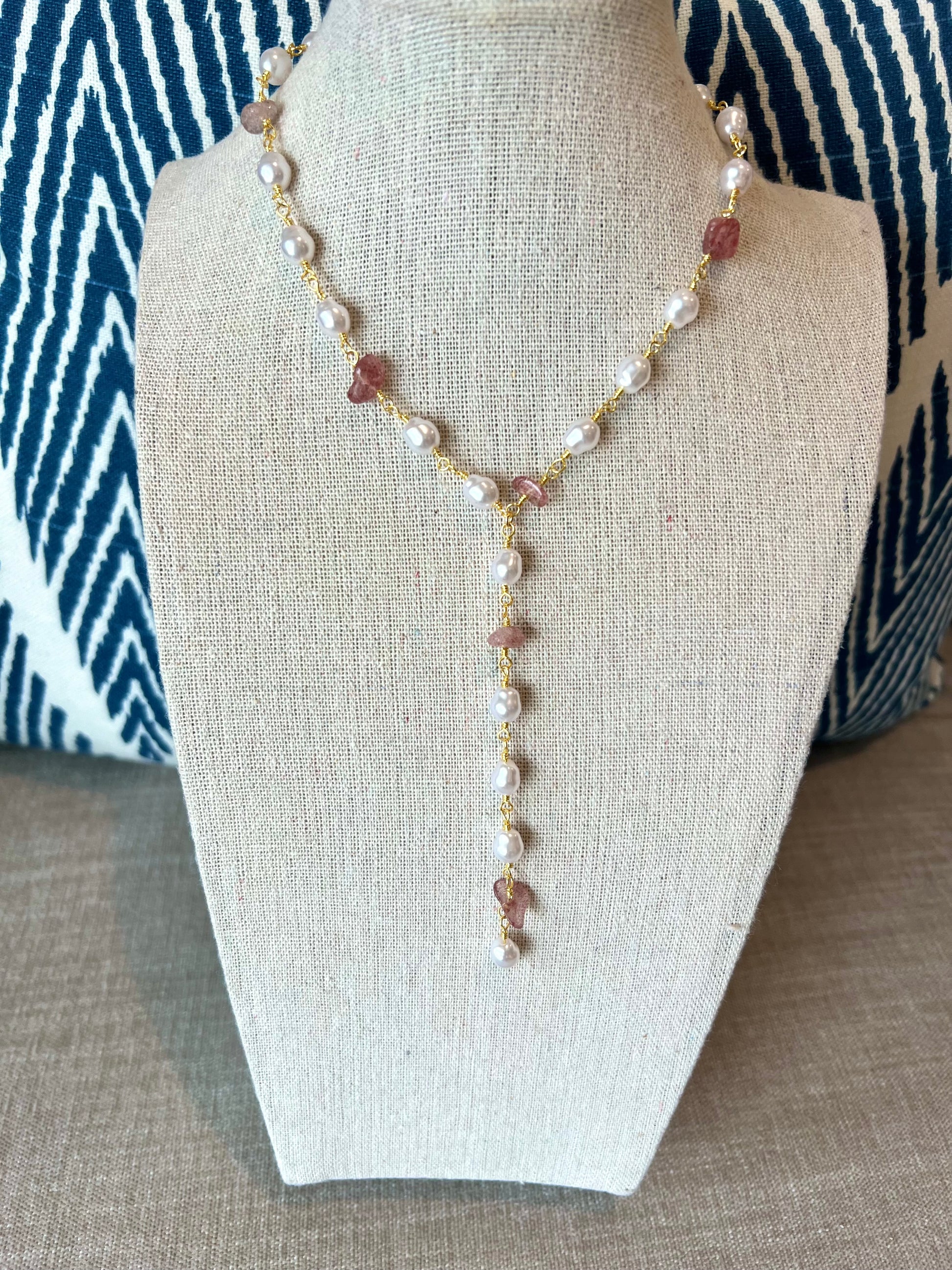 This pearl bead and rose quartz chip y necklace/lariat is a fun twist on traditional. It can stand alone or be layered with or pink opal hand cut gemstone necklace. The necklace is adjustable 15-17" and the y drop is 3.25".