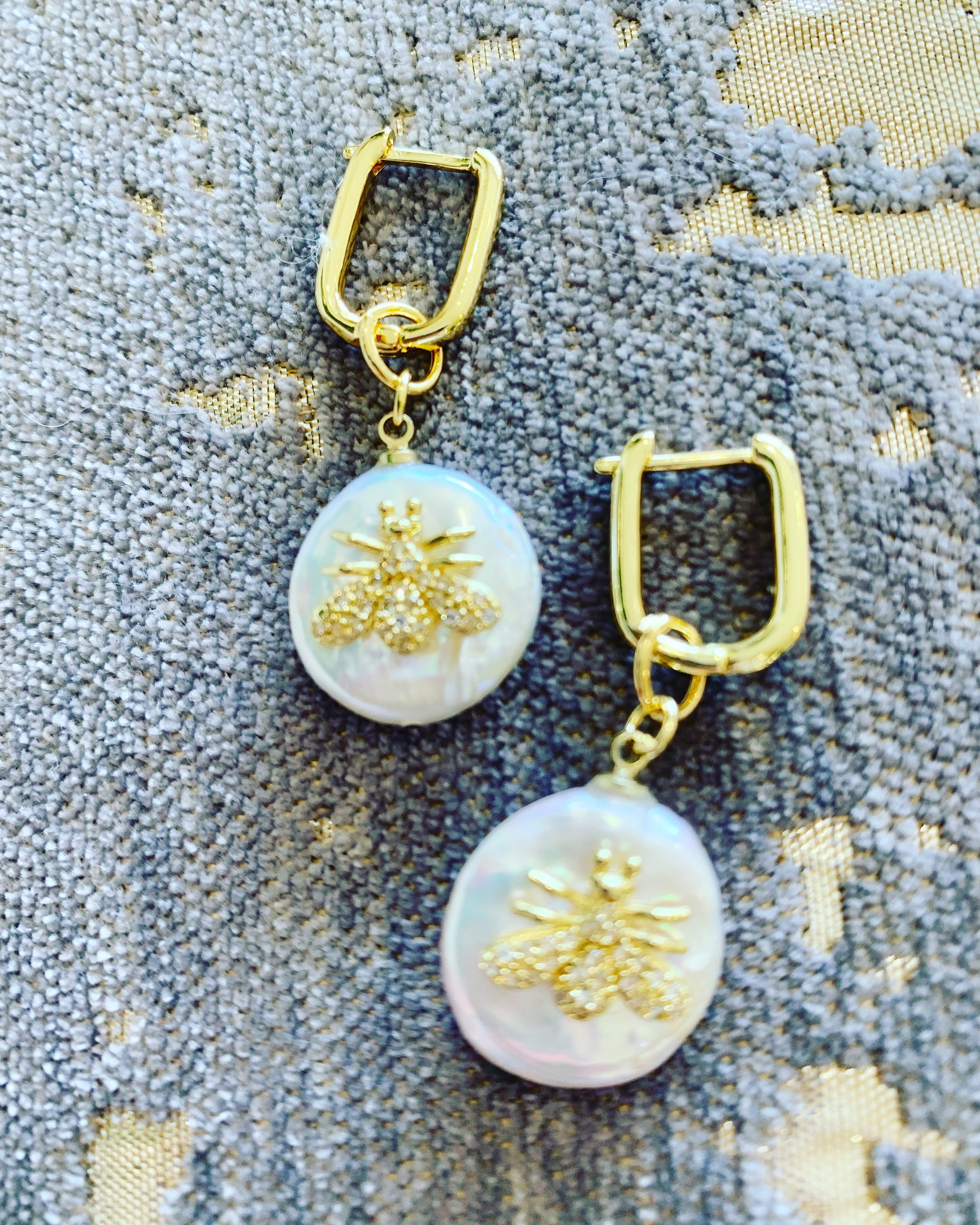 Coin pearl with pave bee on gold plated huggie hoops. Bee .5”. Ty oral length 1.5”