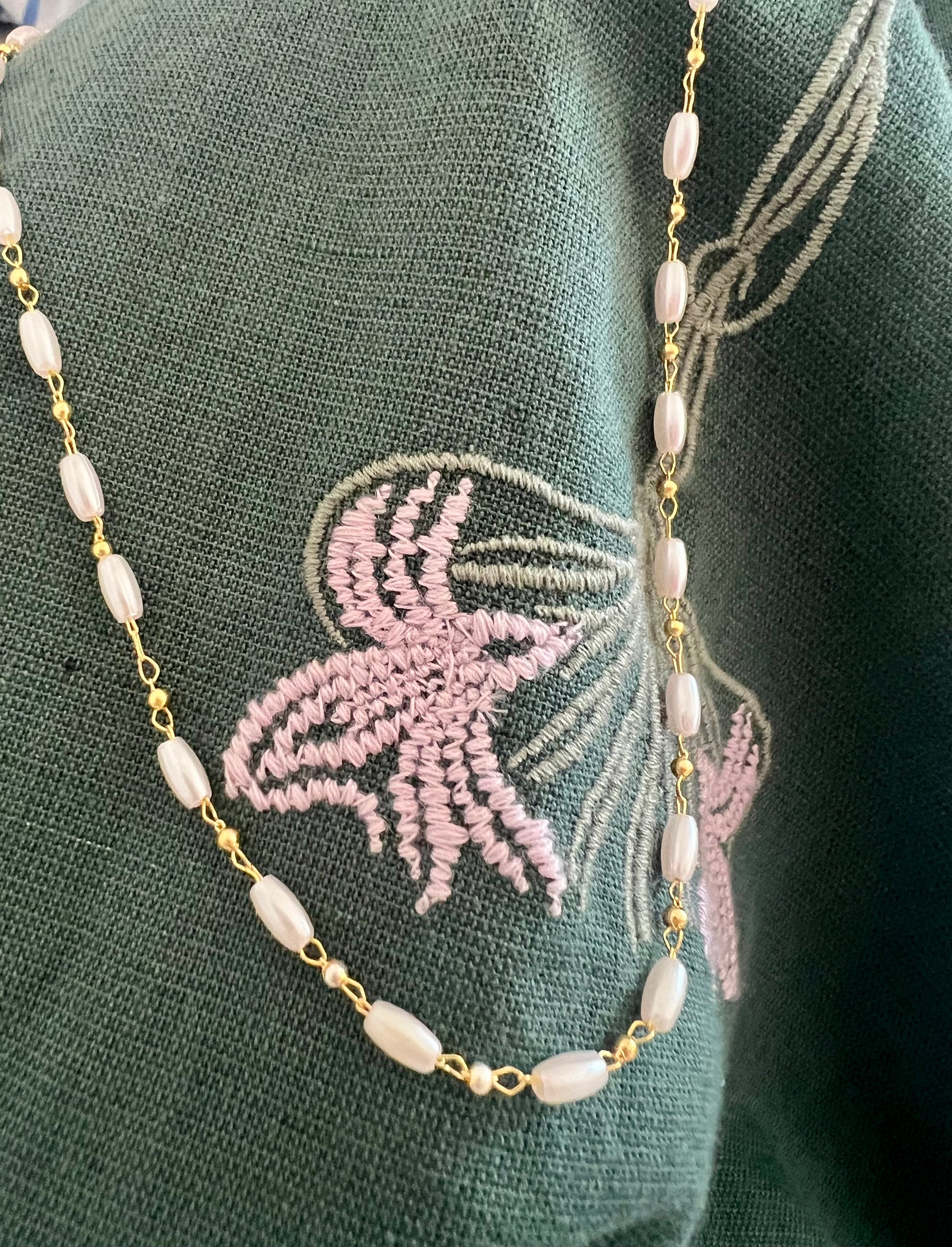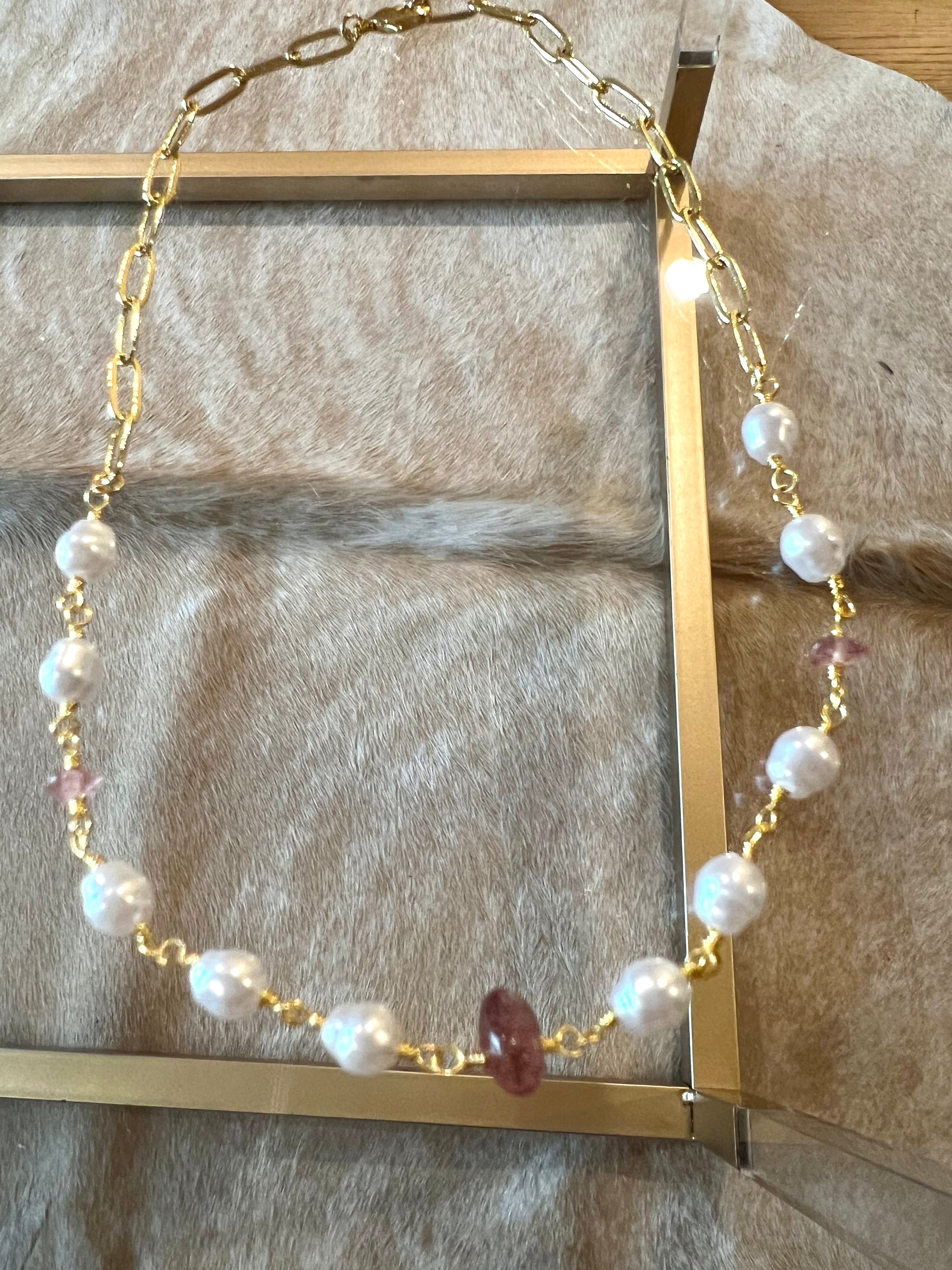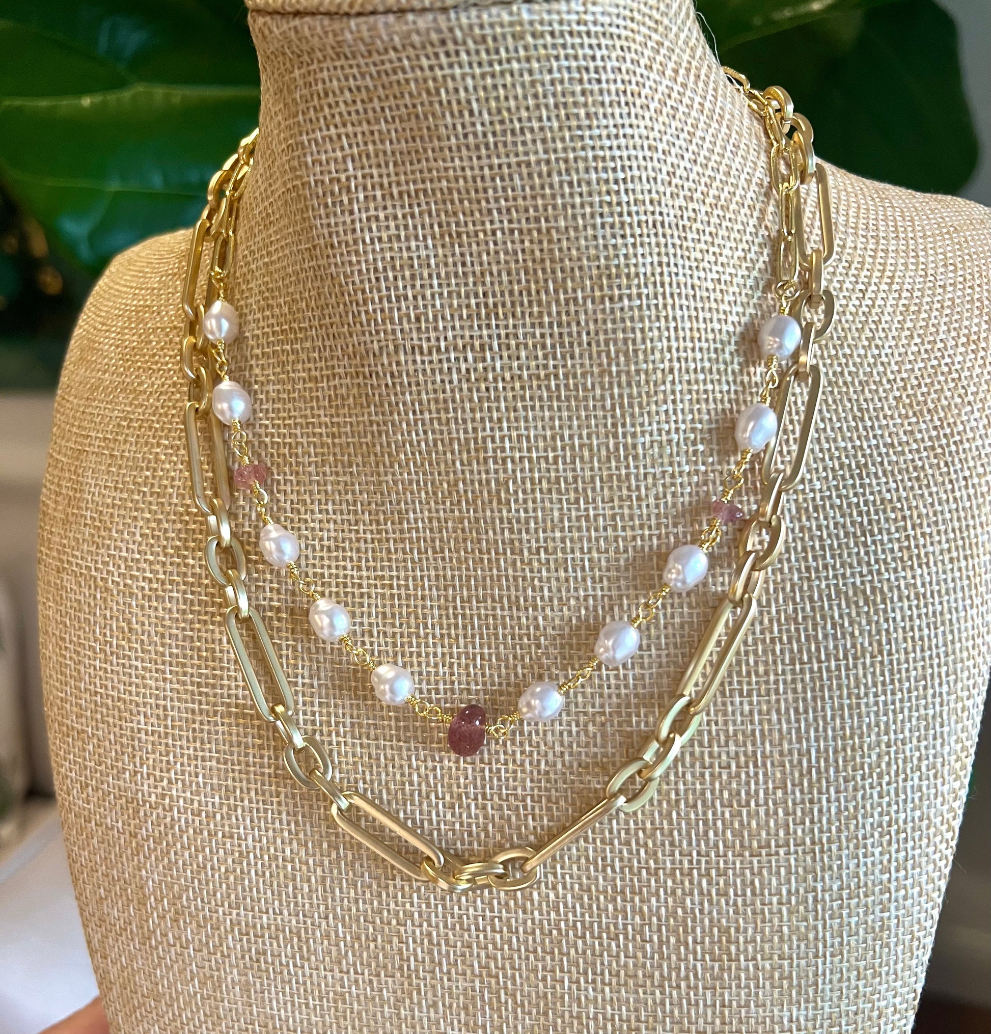 Freshwater pearl beads with gold link and rose quartz chip and gold plated paperclip chain accent. 16" length. Lovely layered or worn alone. This will be worn on repeat .