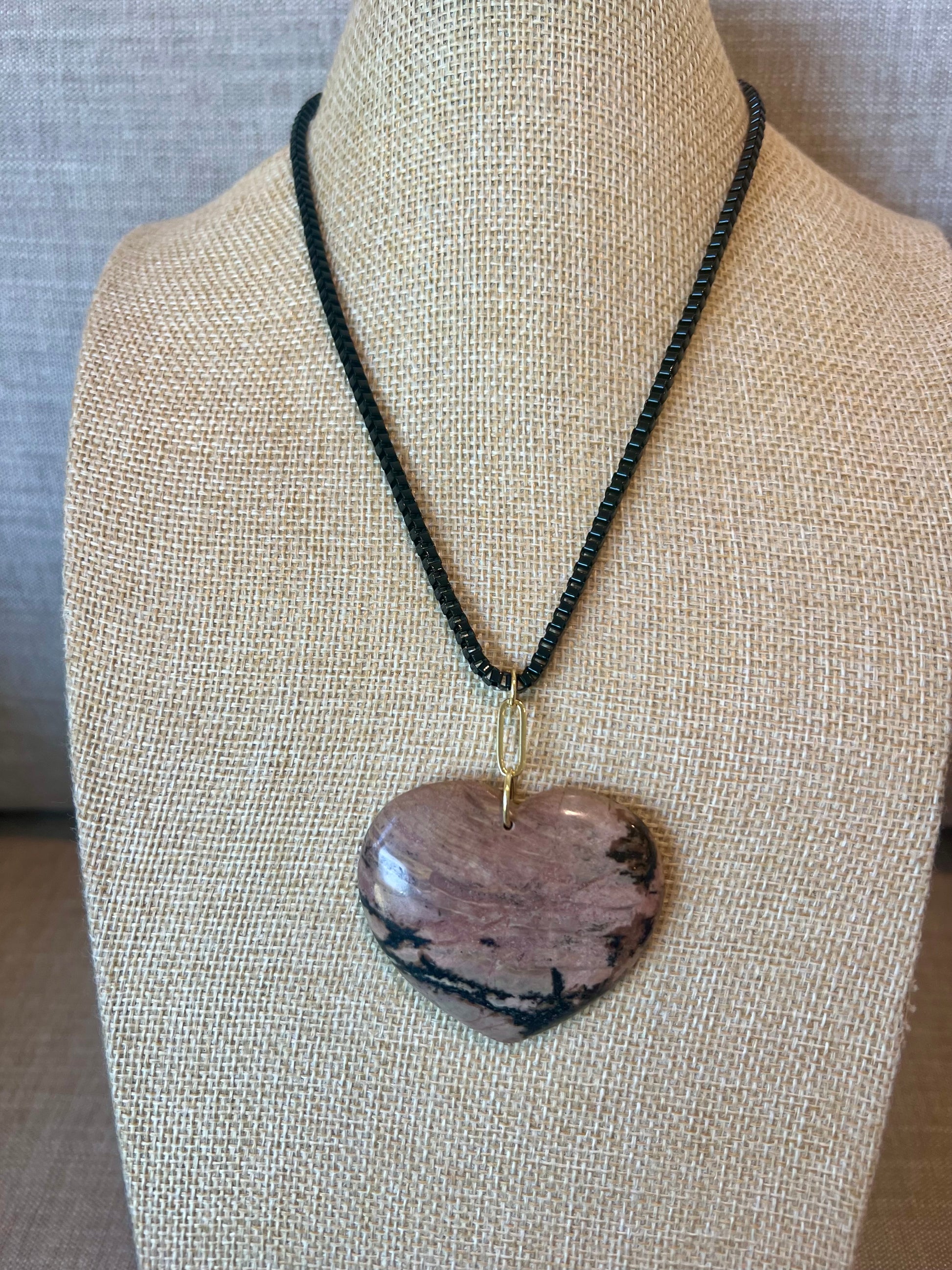 16" puffy gemstone hearts . Sizes vary. 8" w x 1.10" l for turquoise & amazonite , lapis tone 1" x 1.5" , picture Jasper (beige) 1 x 1.25", rhodonite 2" x 1.75" . Pendants on gold plated paperclip chain necklace, beads, black chain or gold filled for turquoise. Custom chain lengths and combination available by special order including gold filled.