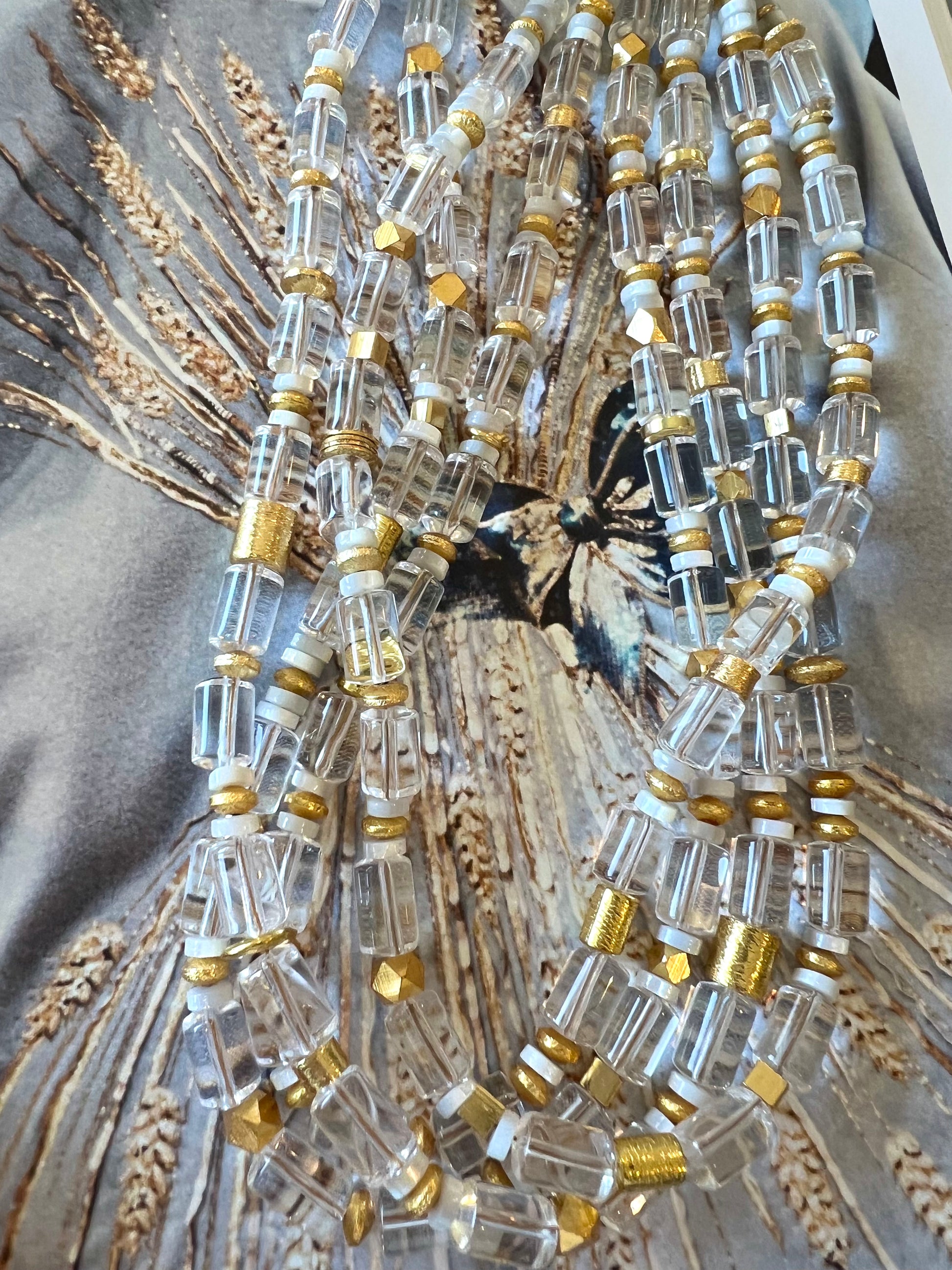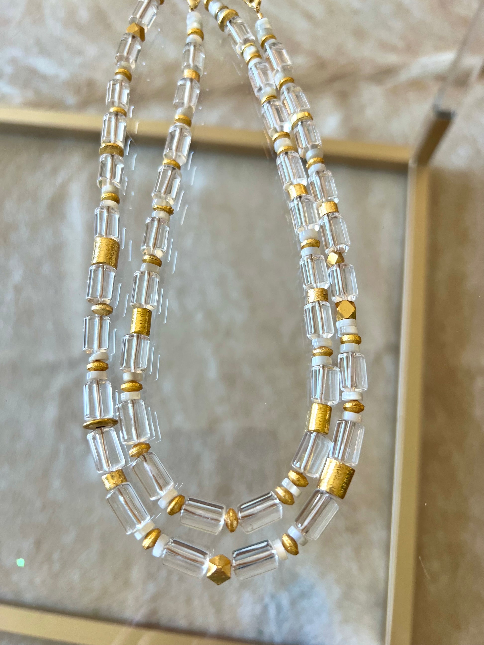 Quartz barrel beads with white troca shell and gold accents . Sold as individual strands but layers well. Available in clear or smoky and adjustable 15-17". Grab yourself and a friend one today!