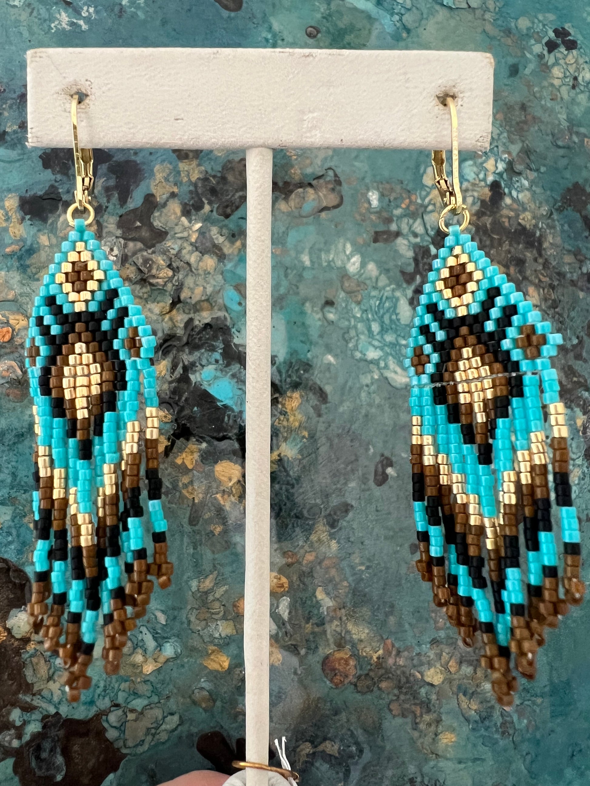Beaded turquoise with mother of pearl accents. Total length on mother of pearl 3.25", turquoise & brown length 3" at center/longest point