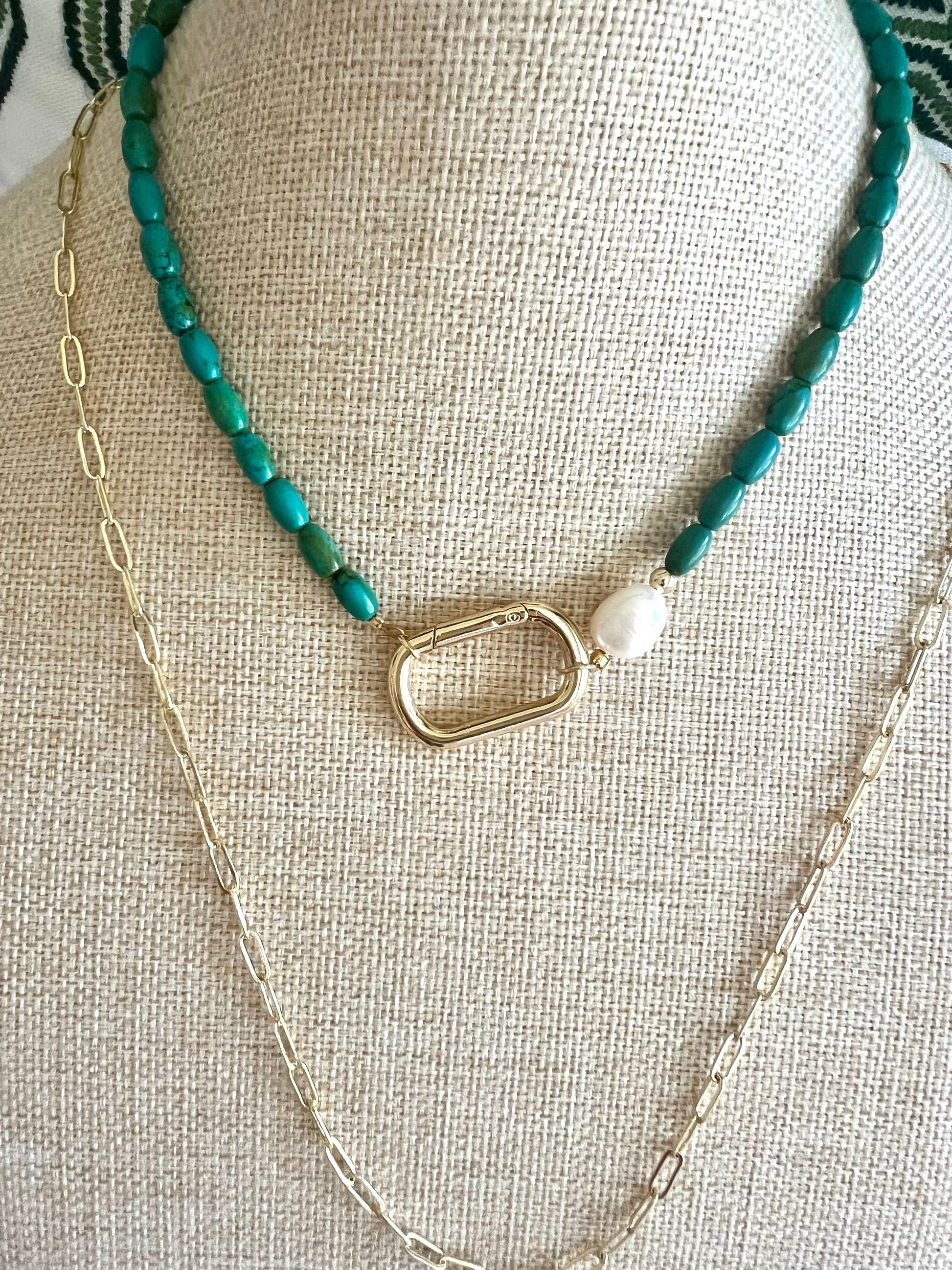 Turquoise is a favorite and this twist incorporates a gold spring lock or carabiner with a pearl accent . Add a charm if you'd like , layer it or wear alone. Length is adjustable 15-17"