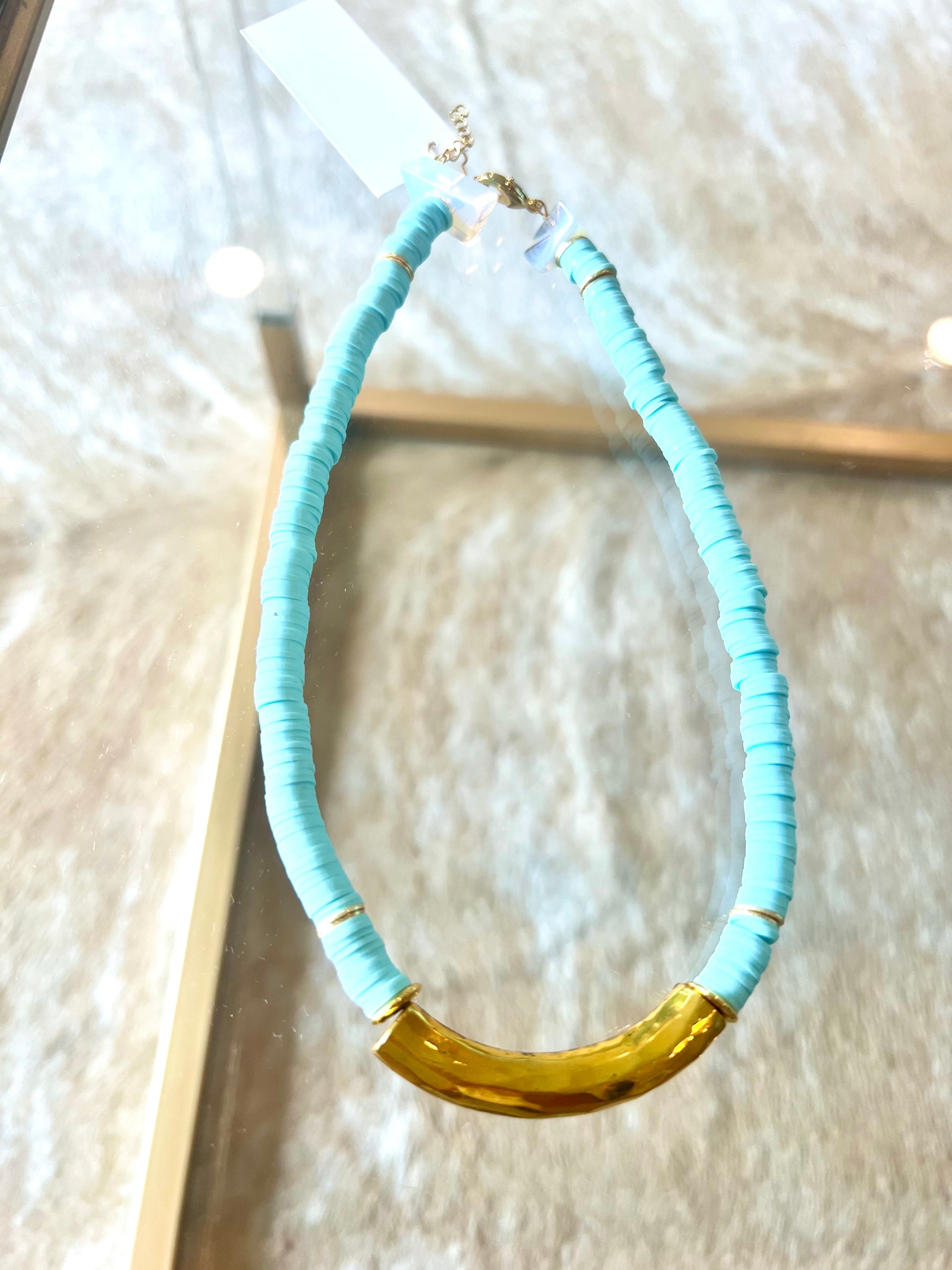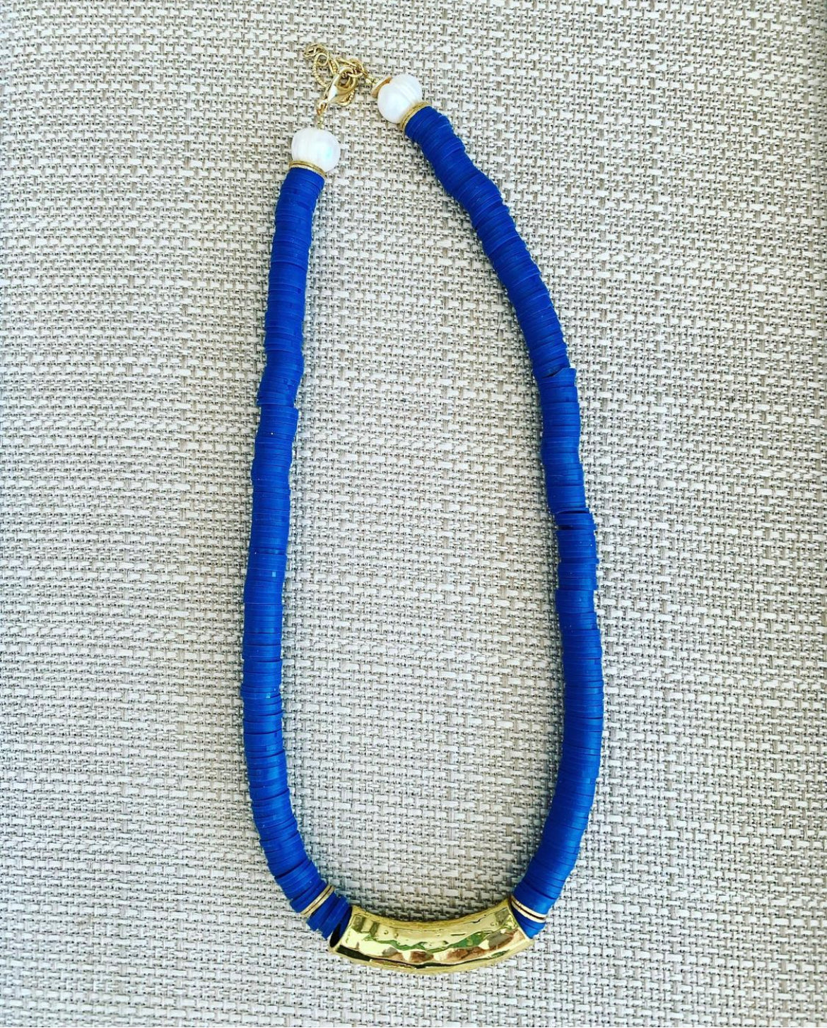 Vinyl necklaces with gold disk accents and gold tube center. Adjustable 16-18” . Various colors available and custom requests. Wear alone or stacked .