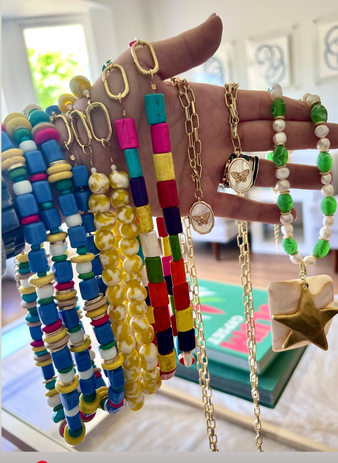 This fun Seaglass necklace is a bright pop to add color to a white t. Wear with carabiner in front or back . Charms can be added . 16" length.